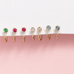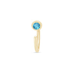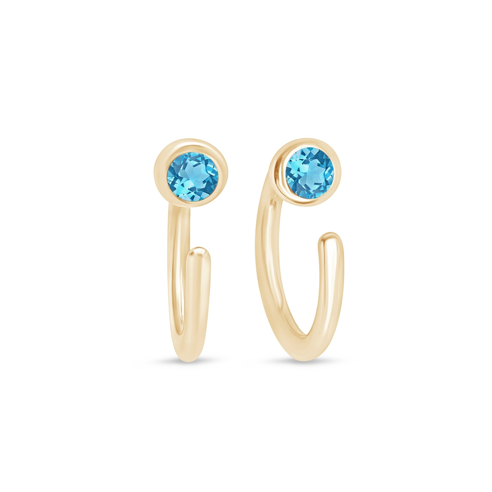 A sparkling round brilliant cut Blue Topaz is bezel set on one side of this open hoop. This brightly polished 14k solid gold and thishuggie earring is perfect for all piercing styles.