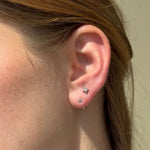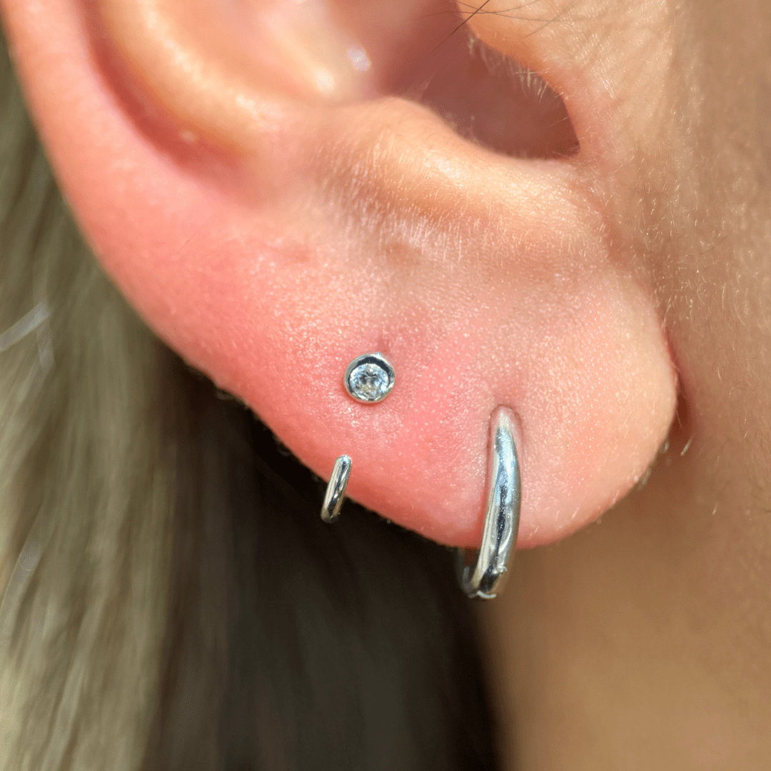 A sparkling round brilliant cut cubic zirconia is bezel set on one side of this open hoop. This brightly polished 14k solid gold and cubic zirconia huggie earring is perfect for all piercing styles.