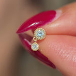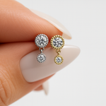 These exquisite natural diamond yellow gold flat-back earrings feature a timeless two-stone dangle and drop design, beautifully crafted in gold to offer both elegance and versatility. Each earring showcases a brilliant round-cut natural diamond, bezel-set with delicate milgrain detailing that adds a touch of vintage charm. A smaller matching diamond gently dangles below, connected by a fine gold link that allows subtle movement and sparkle. Designed for comfort with an 18g threaded flat-back setting, these earrings are perfect for lobe, cartilage, helix, or tragus piercings. Whether you're gifting your mom, or wife, or treating yourself, they make a sophisticated addition to any jewelry collection—ideal for celebrating special moments with timeless beauty and quality craftsmanship.