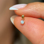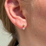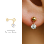 These lightweight, high-quality, brightly polished 14k yellow gold dangle drop earrings feature 0.20 carat solitaire round cut diamonds hand-set into a sparkling bunch. Create a personalized look just for your newest ear piercing with these non-irritating, hypoallergenic 14k gold diamond drop stud piercing that feature a glittering display of diamonds that can be worn along with other earrings of your selection. Stamped 14k for authenticity, these premium piercing 14k yellow gold solitaire diamond drop studs are the perfect selection for your existing or new piercings.