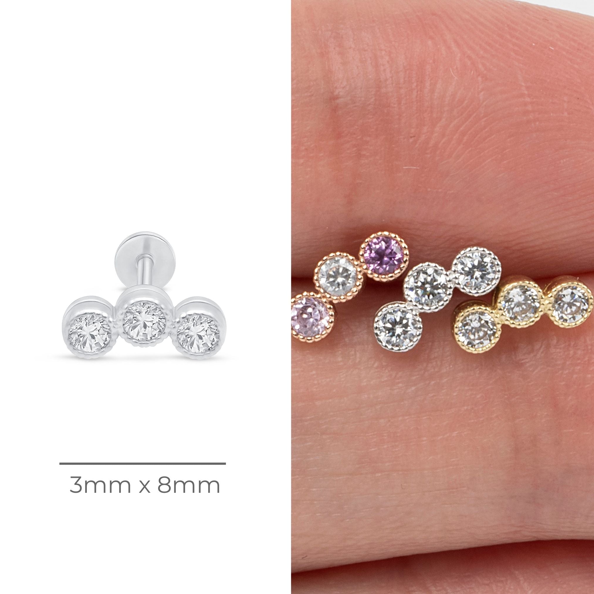 These high-quality, dainty earrings feature three stones on each premium piercing stud, sparkling with the vibrant stone color of your selection. Designed in brightly polished 14k solid gold and made with non-irritating, hypoallergenic materials that are soft on the skin, these piercing studs are perfect for adding a refreshing color that is right on-trend. Sweet and feminine is perfect for anyone on trend, these colorful cluster 3-stone gold petite studs are a perfect way of celebrating your newest ear piercing.