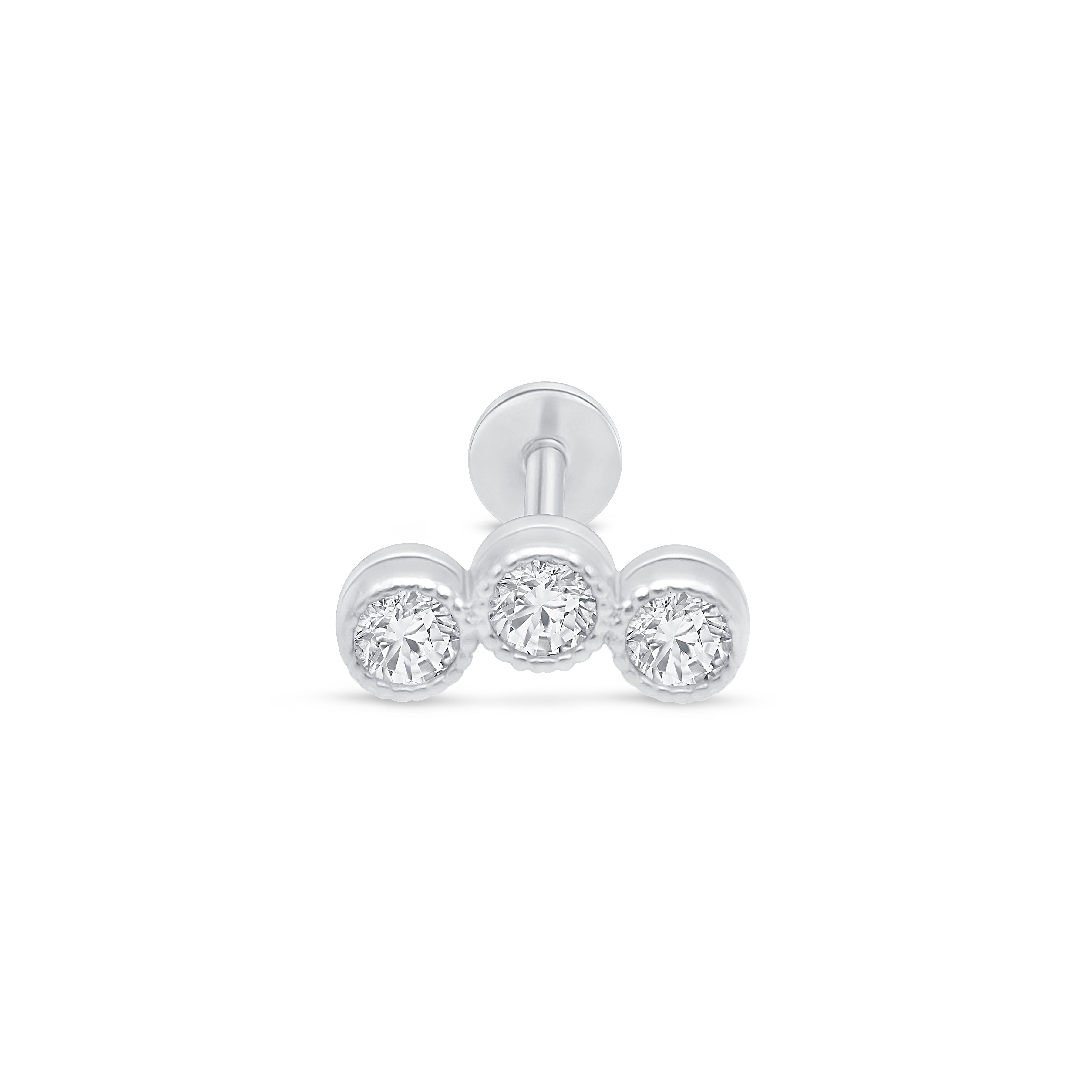 Triple Gemstone Flat Back Stud Earrings Milgrain Set in Solid 14k White Gold
