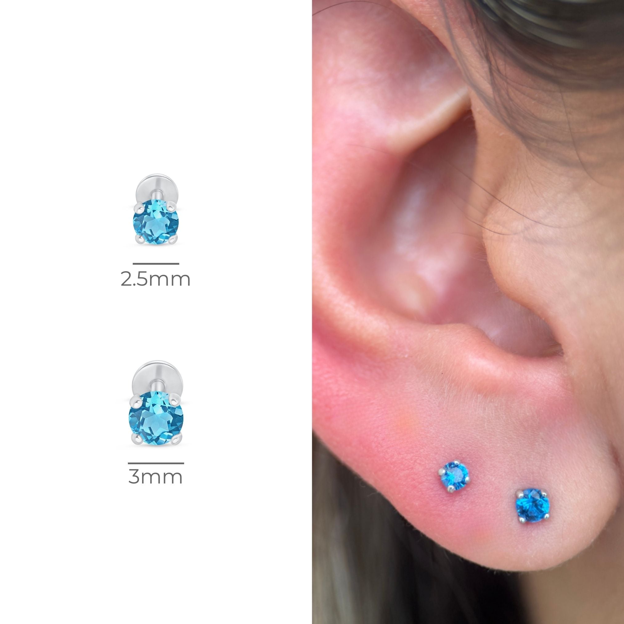 Our classic blue created Topaz flat back earrings are a stunning addition to your cartilage earring collection. Crafted with precision in 14k solid yellow gold, these earrings feature a London blue created Topaz gemstone with a round cut, available in sizes 2.5mm and 3mm. Set in a secure prong setting, these earrings offer both elegance and durability, while the internally threaded labret and flat back earring design ensure comfort for various ear piercings. Choose from different bar lengths for the perfect fit, ranging from small to large. Perfect for both men and women, these hypoallergenic earrings are nickel-free, lightweight, and make a thoughtful jewelry gift, especially for those with December birthdays.