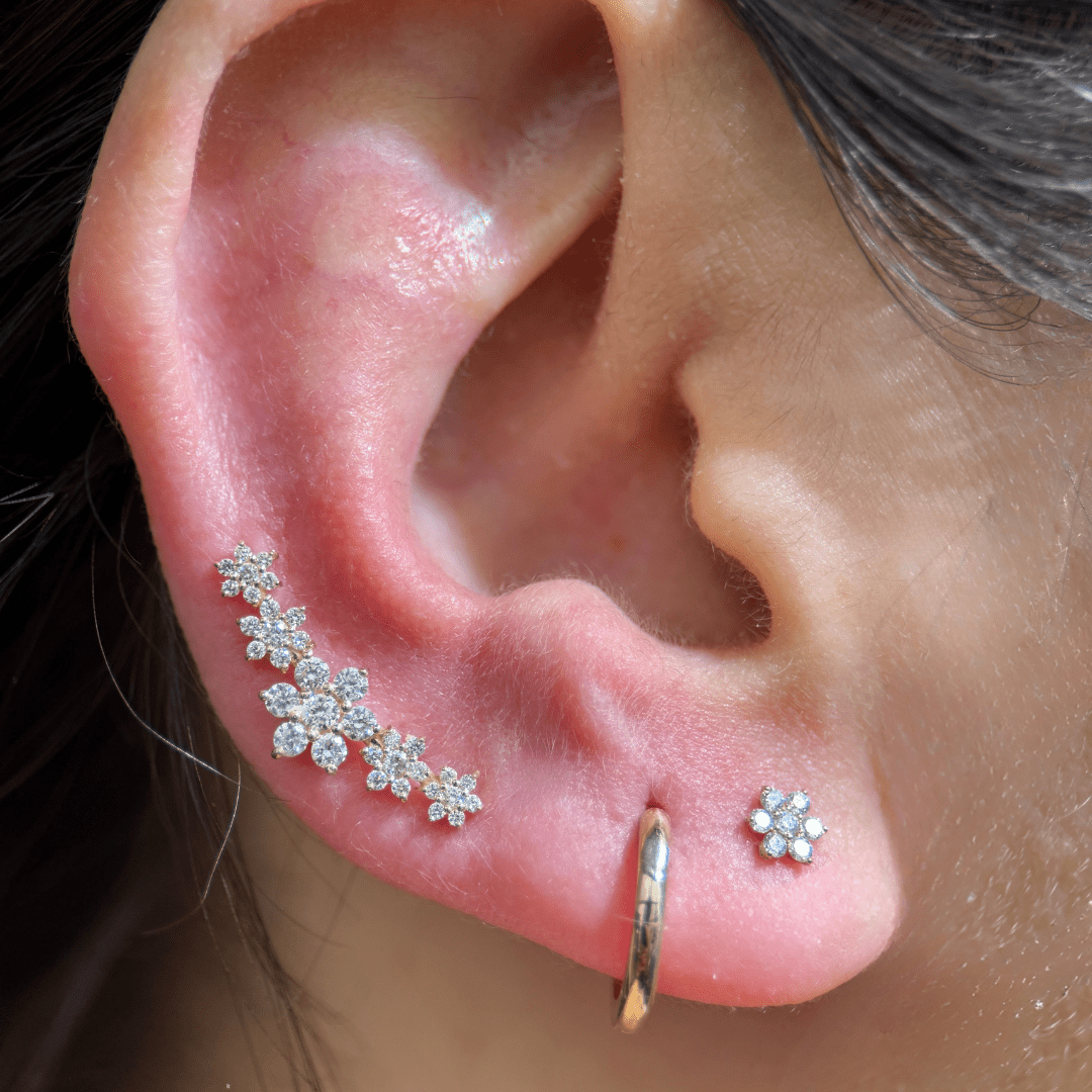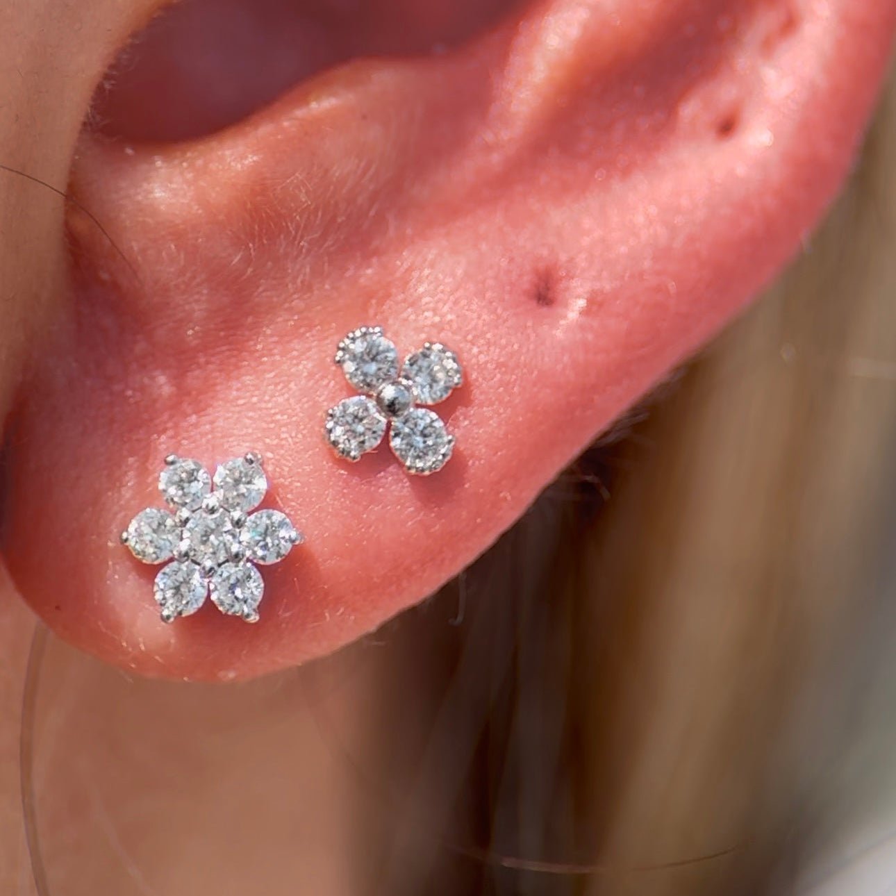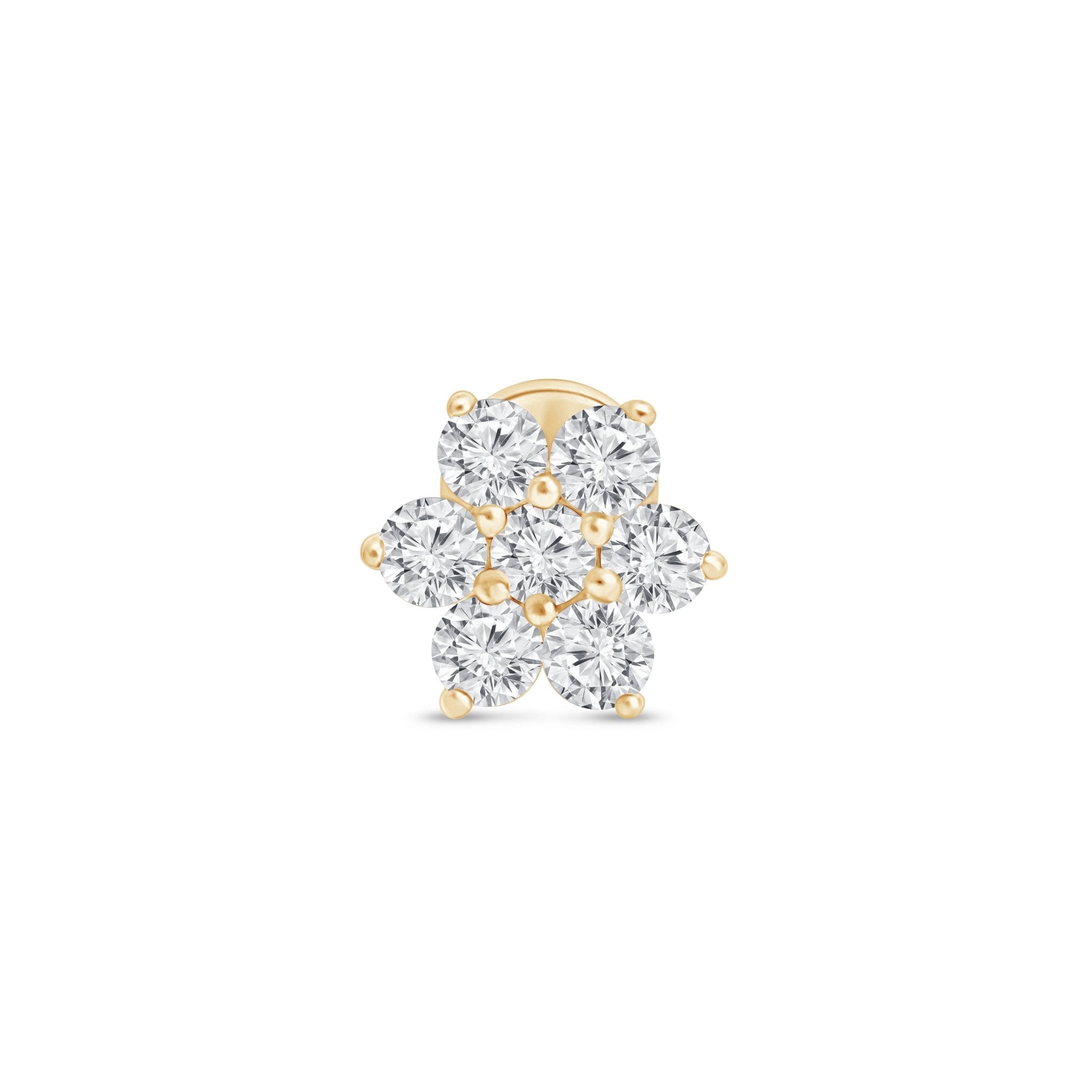 Radiating timeless elegance, these 14k yellow gold diamond flower stud earrings feature a delicate cluster of round brilliant diamonds arranged in a blooming floral design. Lightweight, hypoallergenic, and comfortable, they are perfect for both newly pierced and healed ears. The bright polished finish and refined sparkle make them ideal for everyday wear or special occasions, whether worn solo or layered with other earrings.