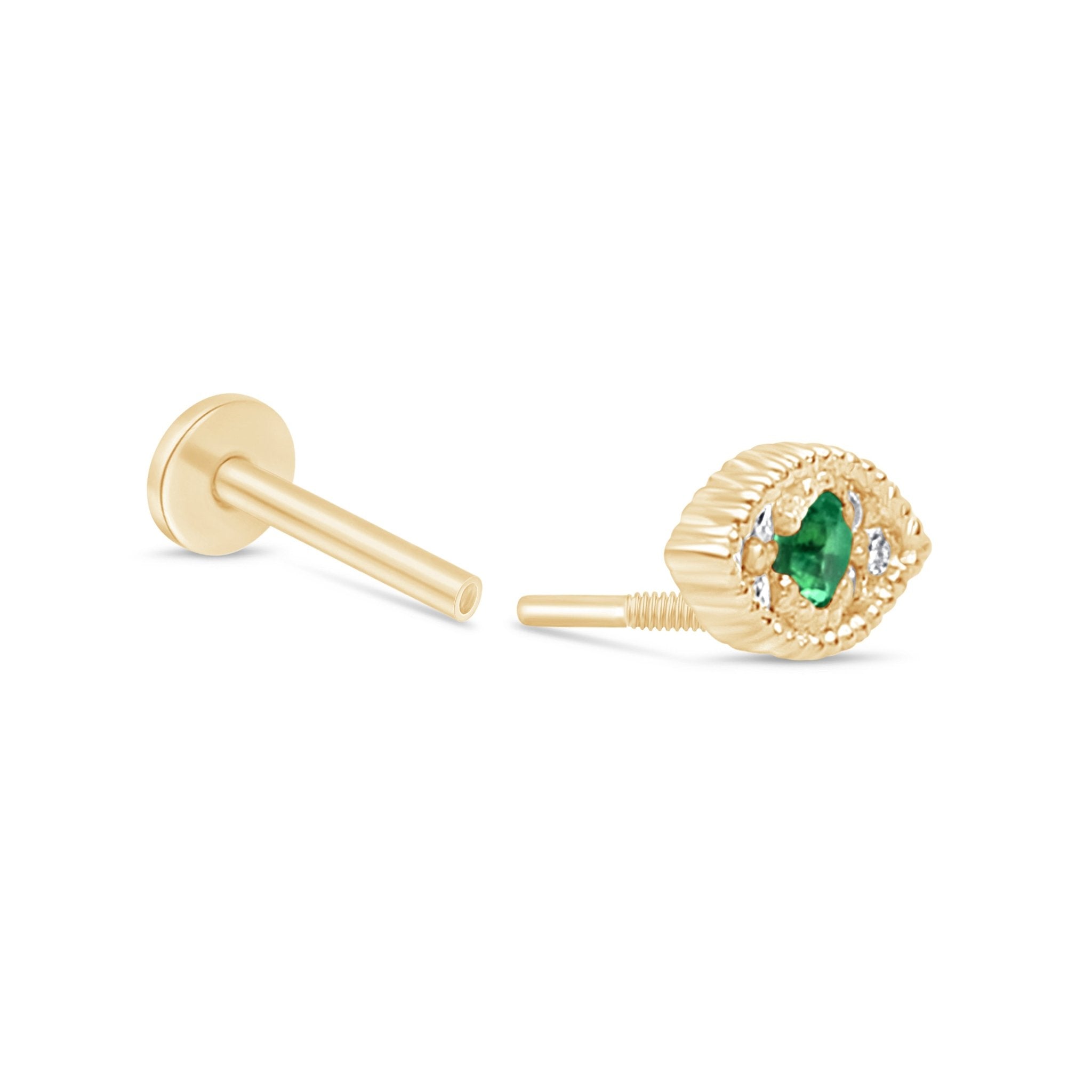 Emerald Evil Eye Flat Back Stud Earrings in Solid 14k Yellow Gold