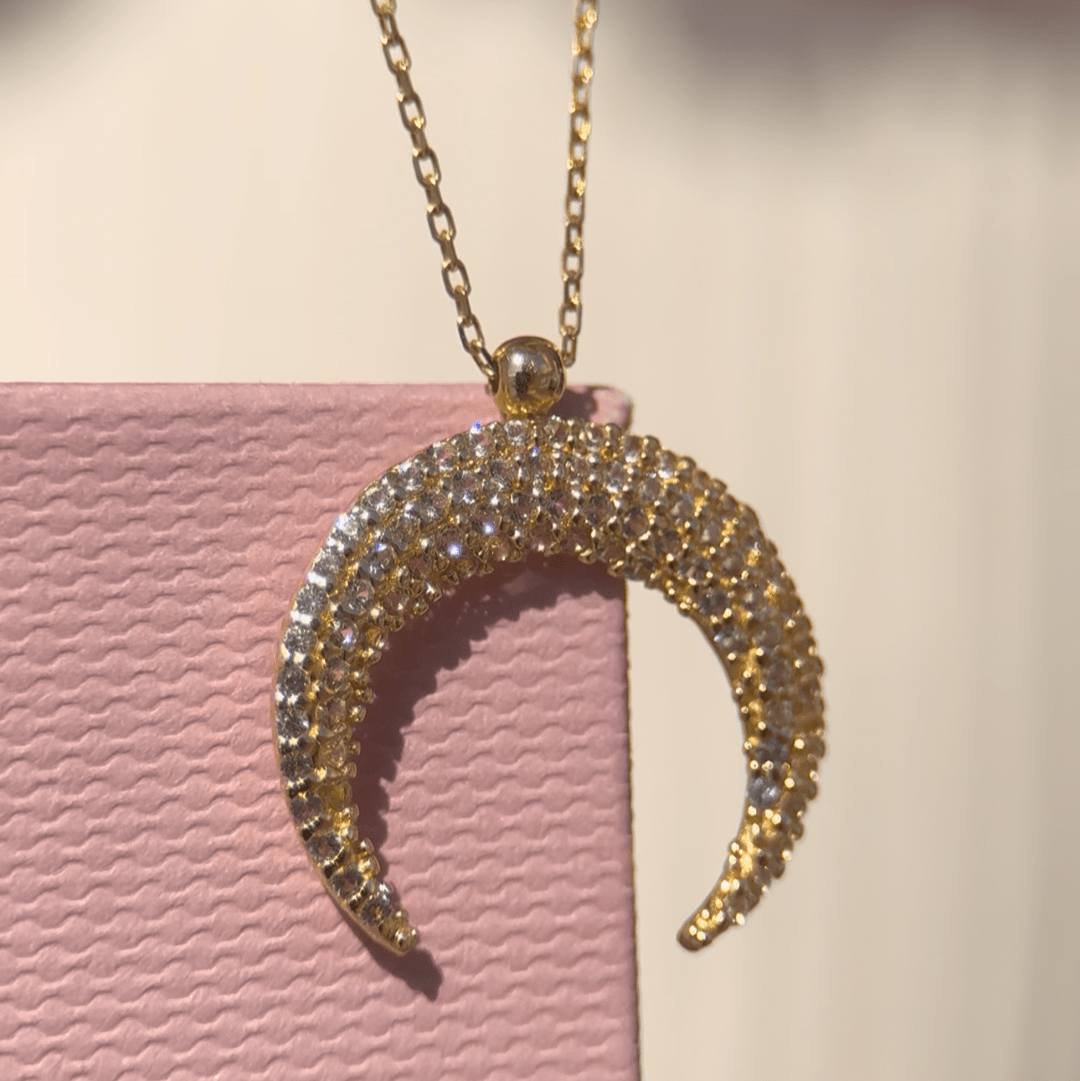 Sapphire Pavé Crescent Moon Necklace in Solid 14k Yellow Gold