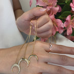 This alluring crescent moon pendant necklace sparkles with micro pavé sapphire gemstones that sprinkles all the way across. This enchanting pendant features oblong bail with a delicate chain threaded through brightly polished 14k yellow gold. The gold necklace is also adjustable with a ring link chain extender for added versatility, at 16 or 20 inches.