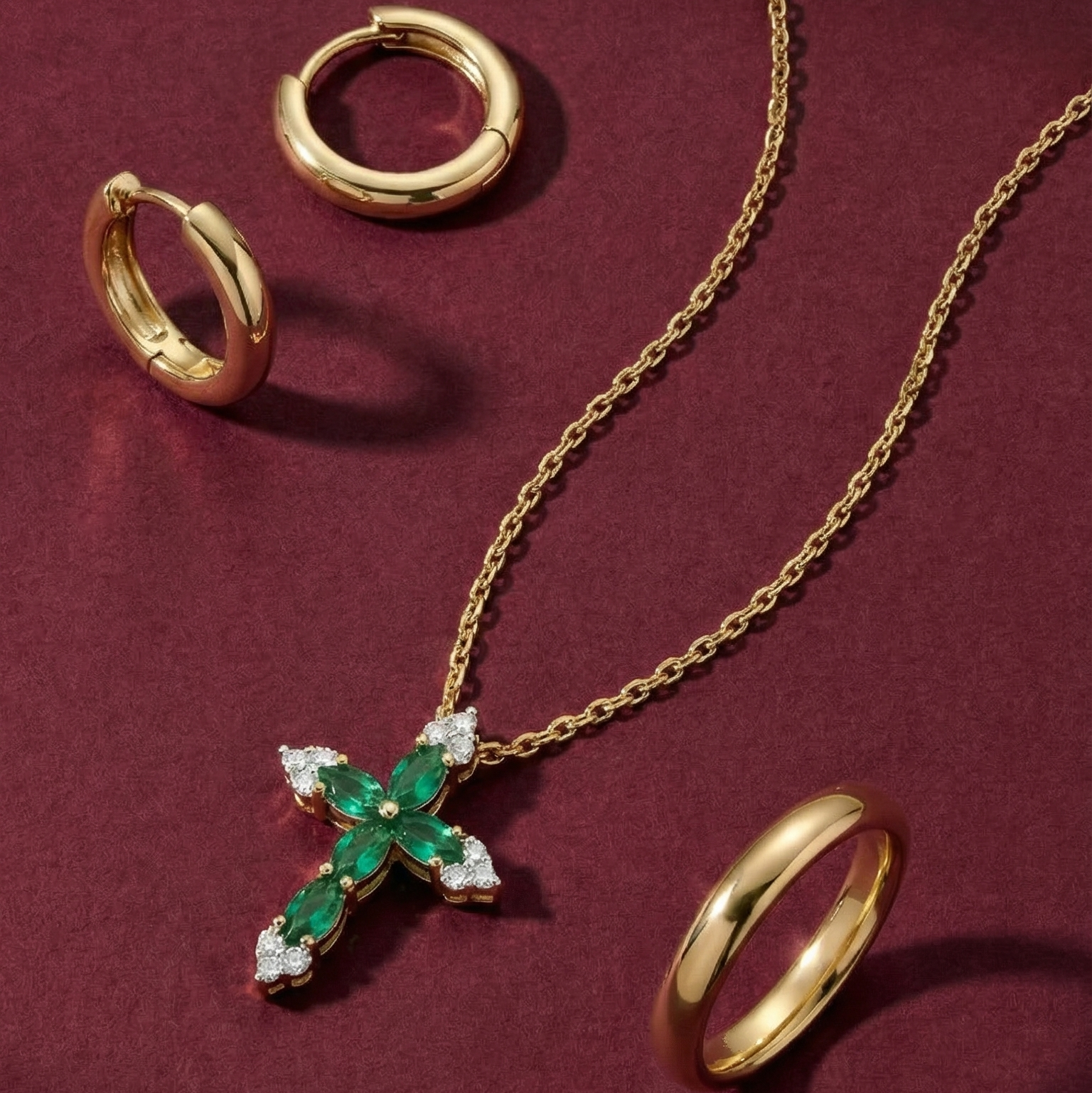 Emerald and White Sapphire Cross Pendant in Solid 10k Yellow Gold