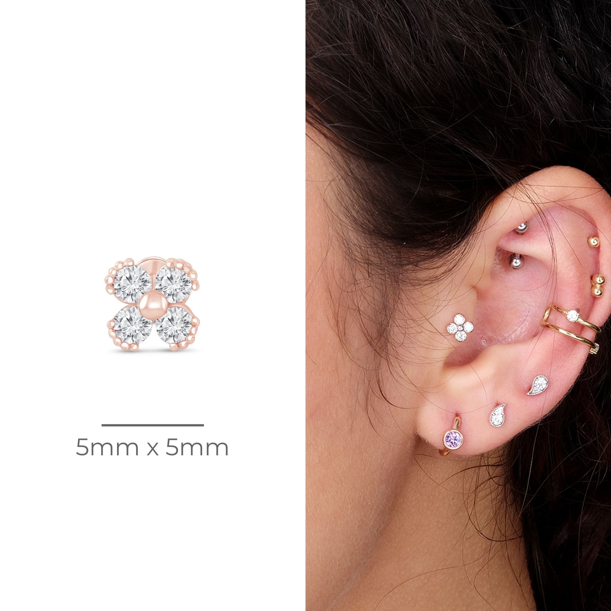 Beaded Diamond Four Petal Flower Flat Back Stud Earrings in Solid 14k Rose Gold