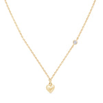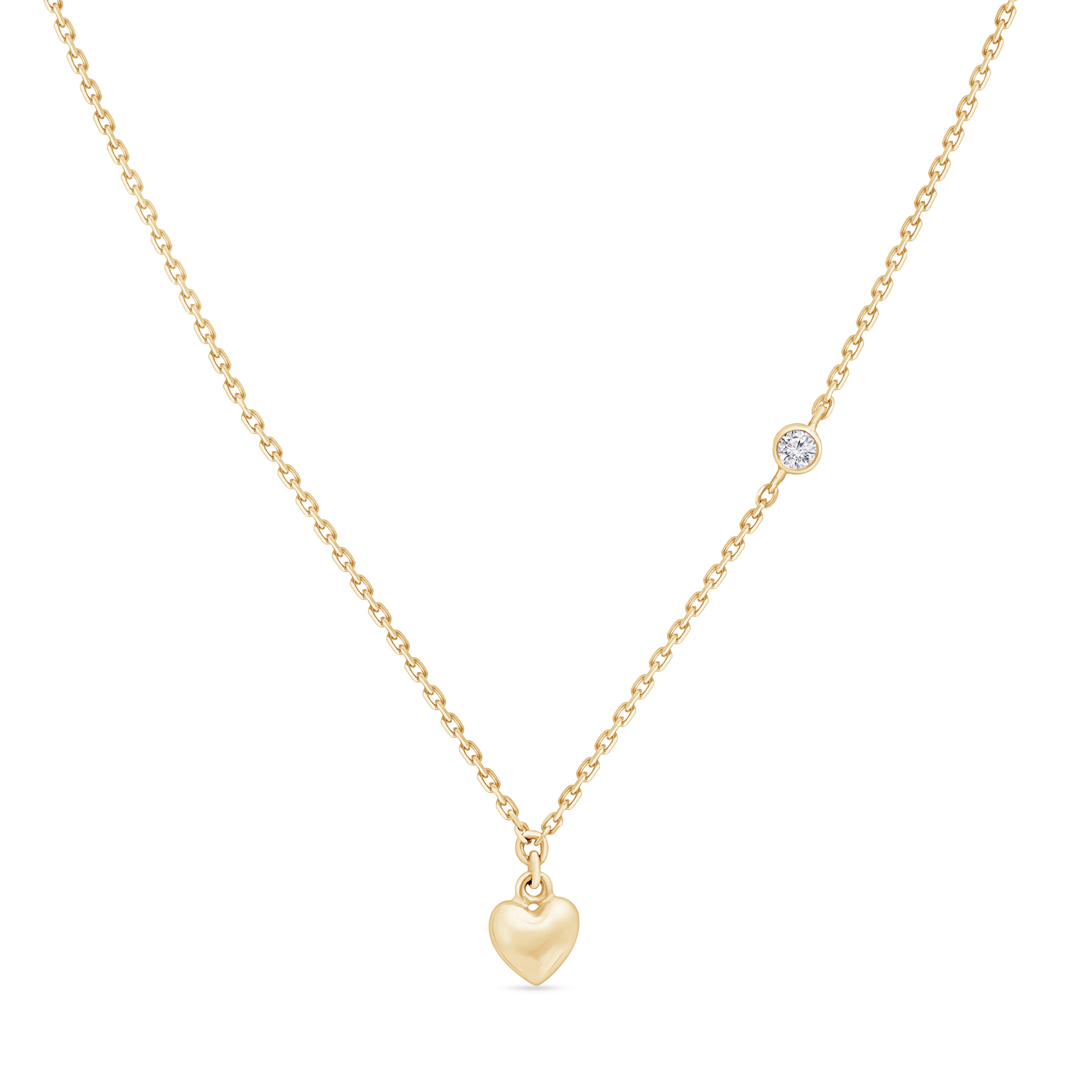 Featuring a tiny gold heart and a sparking round cut bezel set diamond (0.04 total carat weight), this diamond and gold necklace is perfect for everyday wear.