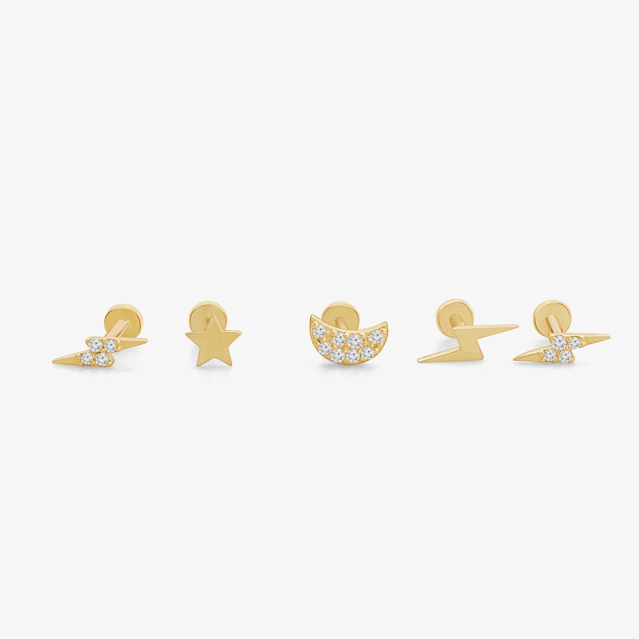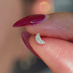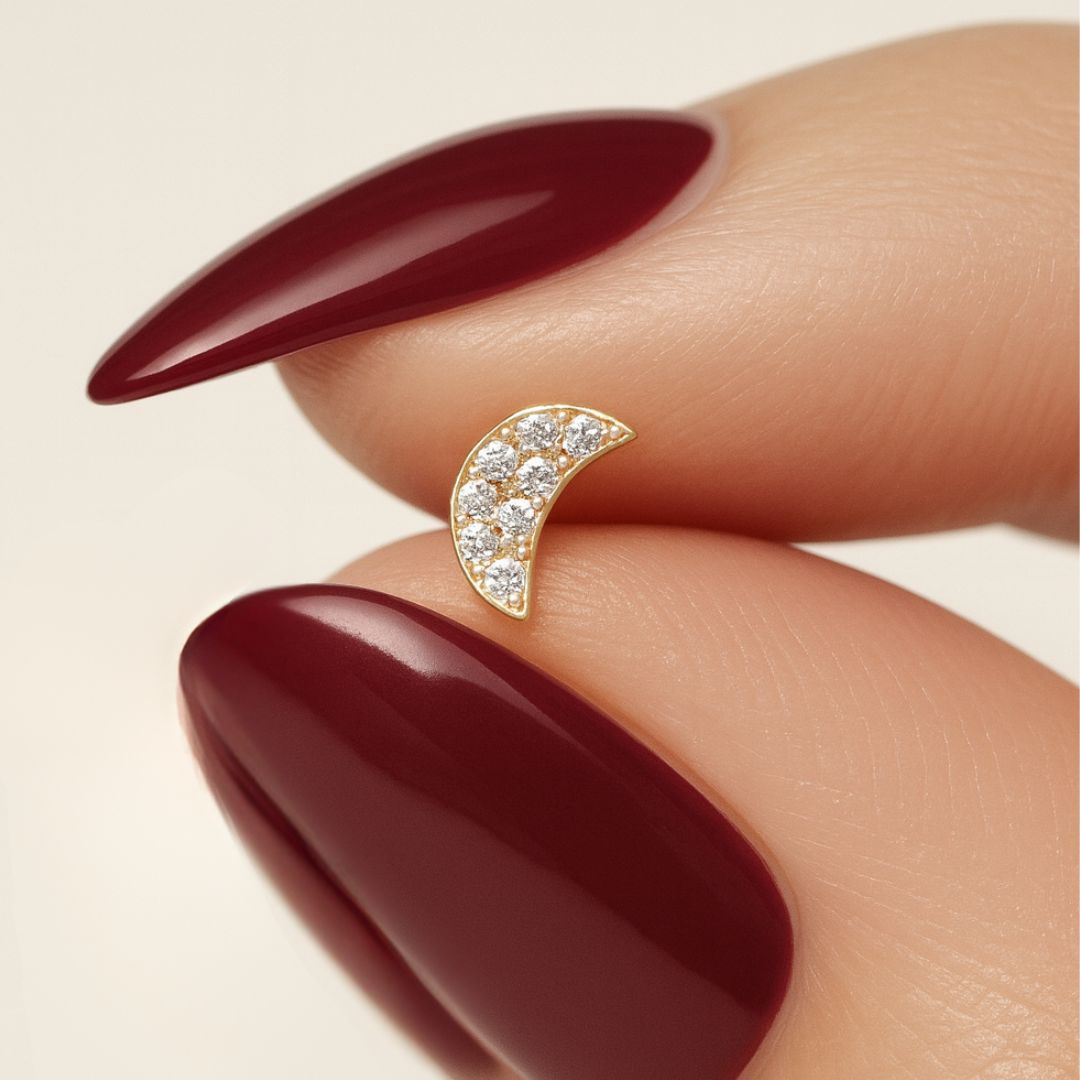 Attention, celestial beings! Refresh your wardrobe with these high-quality crescent moon piercing diamond stud earrings that are studded with sparkling handset diamonds on the front. Designed in hypoallergenic 14k yellow gold, these lightweight, premium yellow gold moon studs are the perfect selection for your existing or next ear piercing! Small in dimension and perfect for pairing with hoops and studs on neighboring ear holes, these non-irritating astrological piercing diamond stud earrings are great for long-term wear with their fashionable vibe. Great gift to yourself or your special one, these tiny diamond moon studs are ideally suited for all occasions.